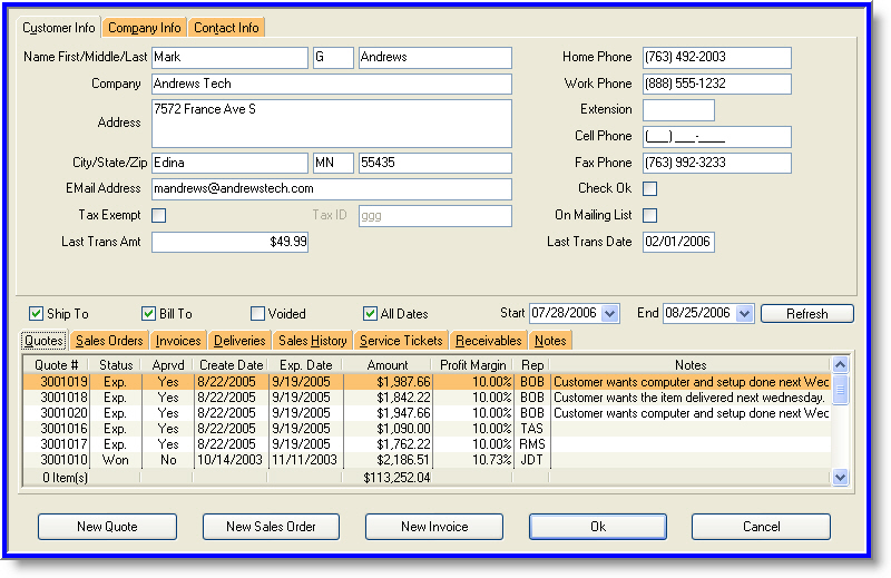 The IRIDIUM Retail Management Software tool tracks all customer information from within one common location, easily displaying quotes, sales orders, invoices, deliveries, sales history, service tickets, receivables, and other related notes—and ultimately linking to the Quoting, Invoicing and Sales Order Systems. Targeted marketing information, such as email addresses and mailing list status may be tracked from this screen as well. Customer information and detailed sales histories may be exported and further utilized for marketing activities such as direct mailings and email campaigns.
