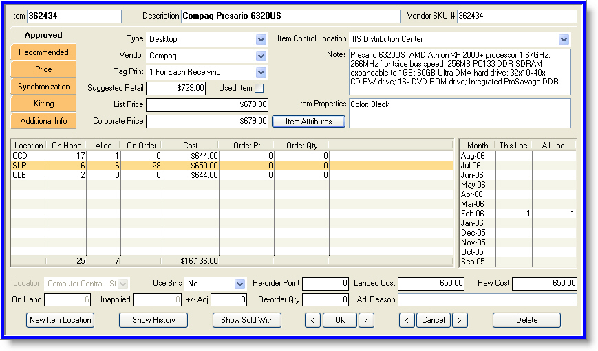 When adding new inventory items to the system, the tool records detailed information for each new item, including: the unique item number/SKU; a text description of the item; the user-definable item type; the sale amount; suggested retail and corporate prices; the item weight; and the primary vendor User-definable item attributes (such as size and color) may be stored in the system and attached to each item. Default selections for printing item tags and specifying re-order points, re-order quantities, and cost adjustments are also available from this screen.